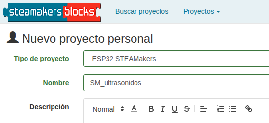 2. Ve a steamakersblocks, inicia sesión y comienza un nuevo proyecto del tipo “ESP32 STEAMakers”: