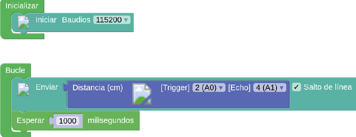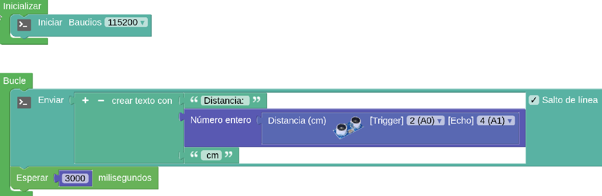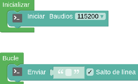 3. En steamakersblocks, lo que harás será ver en la consola del puerto-serie las distancias que mide el sensor de ultrasonidos. Para empezar, en el bloque “Inicializar”, sitúa el bloque “Iniciar Bauds 115200” que encontrarás en la categoría “Comunicaciones / Puerto Serie y en el bloque “Bucle”, pon el bloque “Enviar …” que encontrará en la misma categoría.