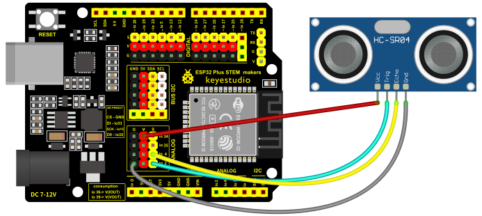 6. Conexión del sensor a la placa. Verás que el sensor de ultrasonidos dispone de 4 pines de conexión: VCC, Trig, Echo, Gnd. Conecta el sensor a la placa tal y como se muestra en la imagen: