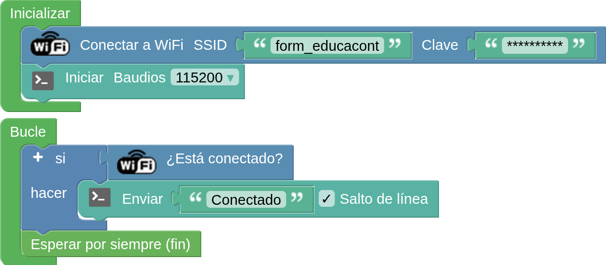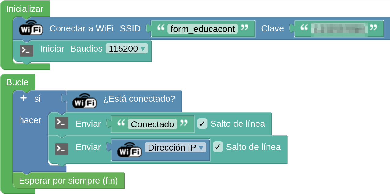 5. Para comprobar que la placa se ha conectado correctamente a la red wifi se puede hacer desde la consola. Situa el bloque “Iniciar Baudios 115200" de la categoría “Comunicaciones / Puerto serie” en el bloque “Inicializar”. En el bloque “Bucle” pon un bloque condicional “Si…hacer” de la categoría “Lógica”. A continuación, de la categoría “Comunicaciones/WiFi/IoT” pon el bloque “¿Está conectado?” en la primera parte del condicional (si…) y en la segunda parte del condicional (hacer) pon el bloque “Enviar” que encontrarás en la categoría “Comunicaciones / Puerto serie”. En el espacio en blanco escribe “conectado”. Por último, coloca el bloque “Esperar para siempre (fin)” que encontrarás en la categoría “Tiempo”; con esto hará que el mensaje se muestre una sola vez en la consola.