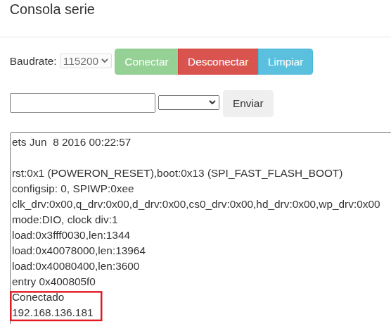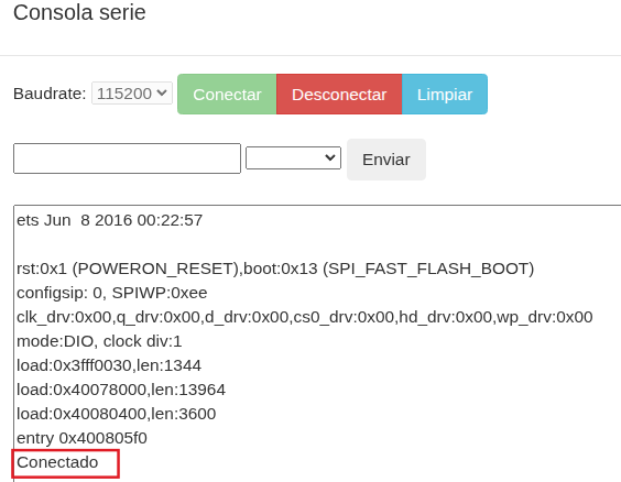 7. Una vez le salga el mensaje que el programa se ha compilado correctamente, haz clic en “Consola” y después en “Conectar”. Ajusta la velocidad y si no se muestra el mensaje pulsa el botón de reset de la placa.