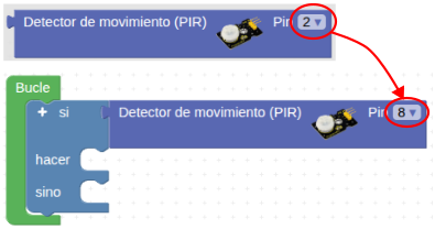 Coloca el bloque de programación “Detector de movimiento (PIR)” de la categoría "Sensores" en la condición del bloque condicional. Indica que el sensor “lectura del sensor de movimiento PIR” está conectado al pin 8. Colócalo dentro del bloque de programación condicional “sí” para que cuando el sensor detecte un movimiento se ejecute una acción. Y si no detecta ninguna, se ejecute otra.