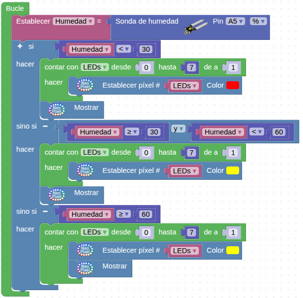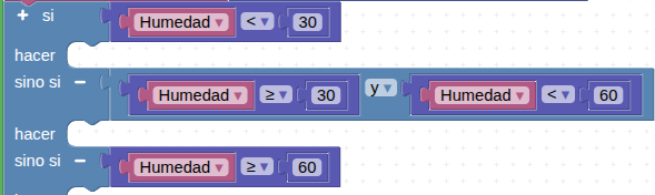 Después, coloca un bloque de comparación y el bloque booleano “y” de la categoría "Lógica" en la condición "si" y "si no, si" respectivamente. Uno de los elementos de la comparación debe ser el bloque del valor de la variable “Humedad” y el otro, los valores de la humedad que queramos establecer, por ejemplo “30” y “60”. De esta forma, define el límite inferior (30), el límite superior (60) y el rango intermedio (entre 30 y 60).