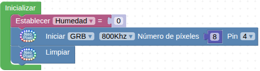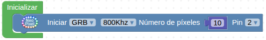 Colócalo dentro del bloque “Inicializar” e indica el número de leds Neopixel conectados al pin 4 de la placa Keyestudio UNO tienen 10 leds. El bloque “Inicializar” debería quedar así tras los pasos dados: