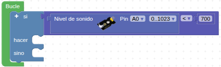 En “Matemáticas” arrastra un bloque para añadir un número y sitúalo después del símbolo “<” (menor que) del comparador. Cambia el valor “0” por “700”, como ejemplo de umbral que determinemos (el sensor de sonido analógico proporciona valores entre 0 y 1023).