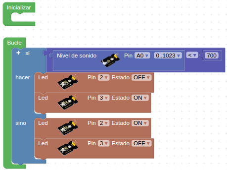 Duplica de nuevo los bloques y sitúalos en el lado derecho del “si no”. Cambia los estados de los pines: ahora el LED rojo (pin 2) estará encendido (“ON”) cuando el nivel de sonido supere el valor umbral y el LED verde (pin 3) estará apagado (“OFF”).