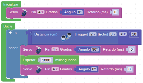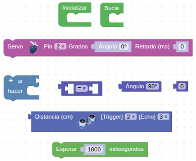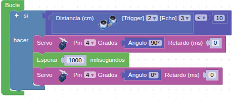 Sin embargo, es necesario devolver al servomotor a su posición inicial, por lo que hay que añadir el bloque “Esperar”. Decide cuál es el tiempo óptimo a "esperar", normalmente se toma 1.000 milisegundos (1 segundo). Seguidamente, añade el bloque del servomotor que lo devuelve a su posición inicial. Por tanto, el programa del bucle principal queda de la siguiente manera: