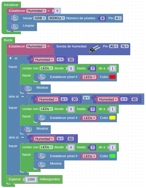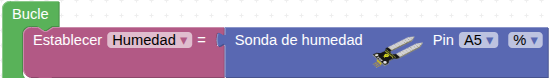 Coloca dentro del "bucle" principal el bloque de la variable creada con el bloque de programación "Sonda de humedad" de la categoría "Sensores" indicando que está conectado al pin A5 y las unidades en %.