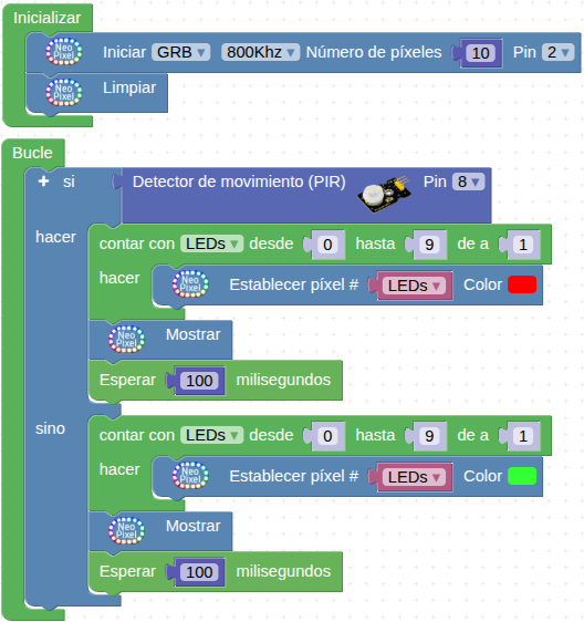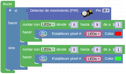 Por último, y para cada caso, coloca un bloque de programación “Contar con” de la categoría “Control” para que se pongan todos los leds de la tira de Neopixel de un mismo color. Cambia el nombre de la variable “i” del contador por LEDs” y colócala dentro del bloque de programación “Establecer pixel #”. Indica que el contador vaya del número 0 al 9 para que encienda los 10 leds de la tira de Neopixel. En caso de que se detecte movimiento, puedes programar que los leds Neopixel se enciendan de color rojo. Y si no se detecta, que se enciendan de color verde.
