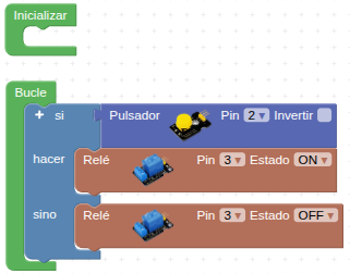 En este punto falta definir, por un lado, qué pasará cuando se pulse el pulsador, y por otro, qué pasará cuando se deje de pulsar. Toma el bloque de programación para controlar el relé de la categoría “Actuadores”, colócalo en cada caso del condicional. Indica que el relé está conectado al pin 3 y que si el pulsador está pulsado, el estado del relé debe estar en “ON”, y si no lo está, en “OFF”.