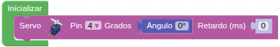 Para asegurar que el servomotor realice un movimiento de forma correcta, es necesario “reinicializarlo” al iniciar el programa. Por eso, en el bloque “Inicializar”, coloca el bloque de programación del servomotor para que se inicie en la posición 0º.