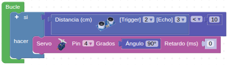 A continuación, de la categoría “Motor - Servo” selecciona el bloque de programación “Servo”. Colócalo dentro del bloque condicional “si” para que cuando se detecte una distancia menor de 10 centímetros el servomotor haga un movimiento. Por ejemplo, programa que se mueva primero en la posición angular 90º. Indica que has conectado el servomotor al pin 4.