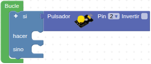 A continuación, debes introducir la condición a evaluar para ejecutar una acción u otra, que en este caso consiste en que si el pulsador está pulsado, se activa el relé y, por tanto, se pone en funcionamiento la bomba de agua, y si no lo está, no funciona. Encontrarás este bloque en el apartado “Sensores” con el nombre de “Pulsador”. Tienes que colocarlo en el conector justo al lado del “si”, y el programa quedará configurado de la siguiente manera: