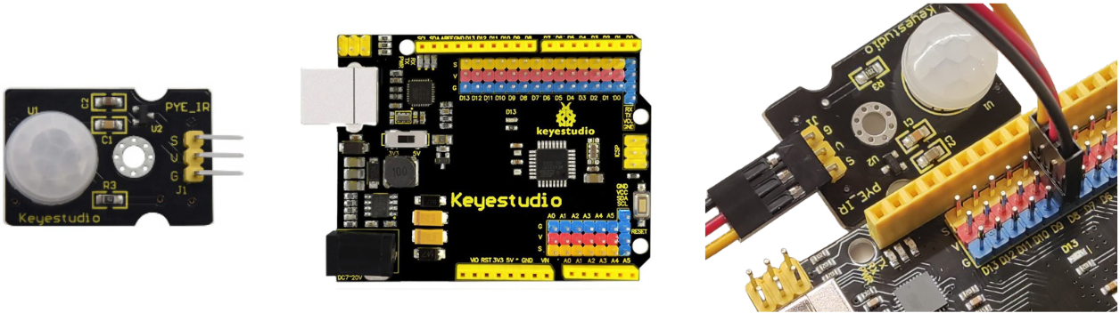 Hecho esto, conecta el sensor de movimiento PIR en uno de los pines GVS, por ejemplo el pin D8, de la placa Keyestudio UNO como en la siguiente imagen: