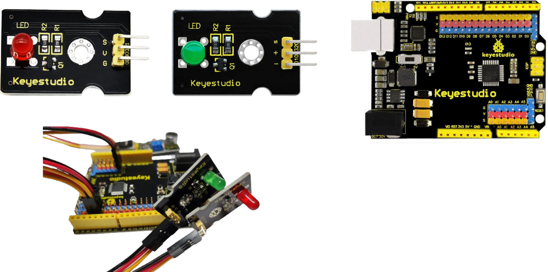 Conecta los leds a la hilera de pines de entradas y salidas digitales GVS. Por ejemplo, conecta los cables GVS del LED rojo en el pin P0 y el LED verde en el pin P1. Comprueba que el cable negro (GND) del LED coincida con el pin azul (GND) de la placa Keyestudio UNO.