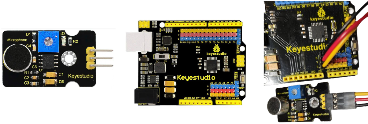 Para empezar, conecta el sensor de sonido analógico a uno de los pines A0-A5 de la placa Keyestudio UNO. Por ejemplo, puedes conectar el cable GVS al pin A0. Es necesario que el cable negro (GND) del sensor de sonido coincida con el pin azul (GND) de la placa Keyestudio UNO.
