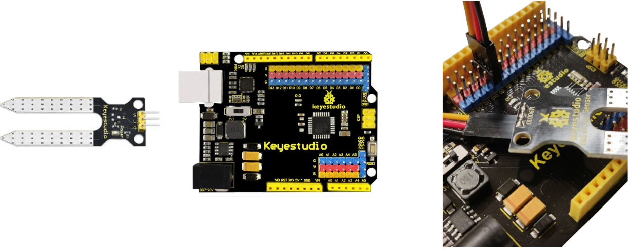 Después, conecta el sensor de humedad a la Keyestudio UNO, por ejemplo en el pin A5, ya que es un sensor analógico, como en la siguiente imagen. Es necesario que el cable negro (GND) del sensor coincida con el pin negro (GND) de la placa para que la conexión sea correcta.