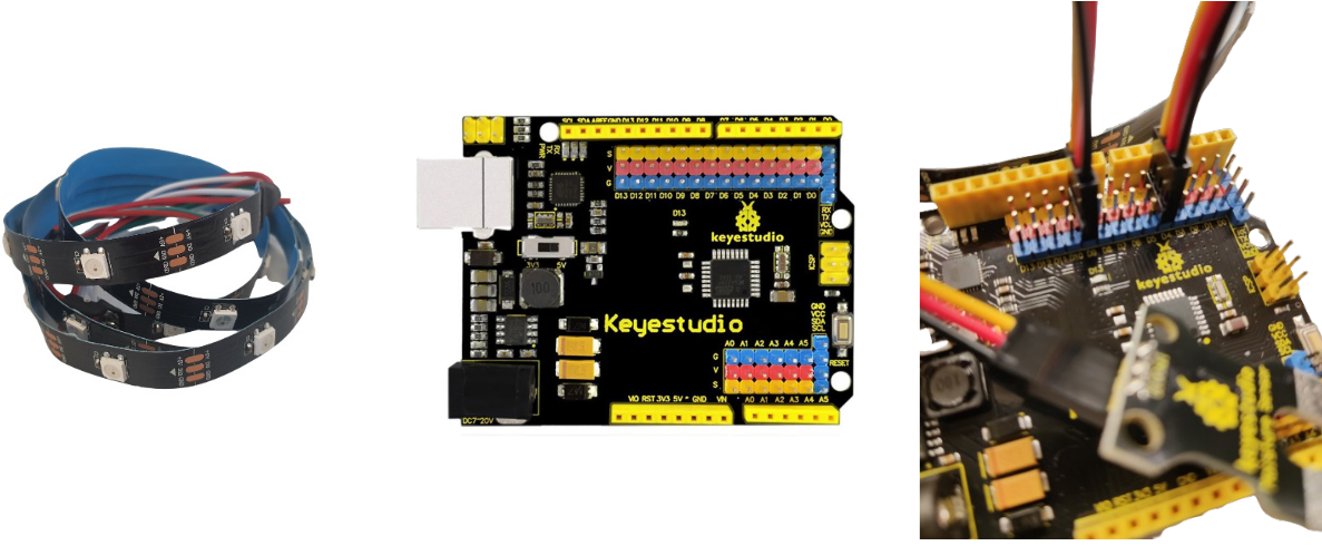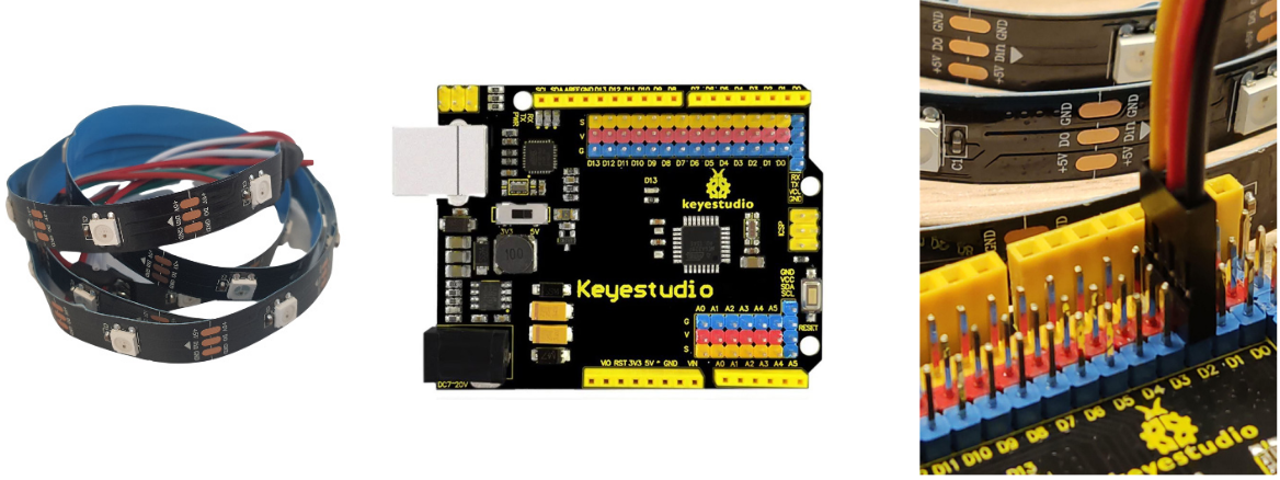 En primer lugar, conecta la tira de leds Neopixel en uno de los pines GVS, por ejemplo el pin D2, de la placa Keyestudio UNO como en la siguiente imagen: