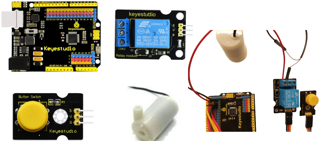 Antes de empezar a programar es esencial que conectes adecuadamente el pulsador, el relé y la bomba de agua con la placa Keyestudio UNO.