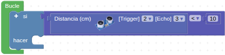 Preparados los componentes, es hora de realizar el programa. Dentro del "bucle" principal coloca el bloque de programación "si hacer". Dentro de este condicional, añade el bloque de comparación de la categoría lógica. Uno de los elementos de la comparación debe ser el bloque de lectura del sensor de ultrasonidos ya configurado y el otro, el valor de la distancia, que en este caso puede ser de 10 centímetros, para detectar cuándo un objeto está cerca de la barrera. El bloque para escribir un valor numérico se encuentra dentro de la categoría “Matemáticas”. El programa en este punto debería estar así: