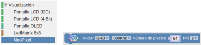 Para programar la tira de leds Neopixel, primero toma este bloque de programación de la categoría Visualización - Neopixel