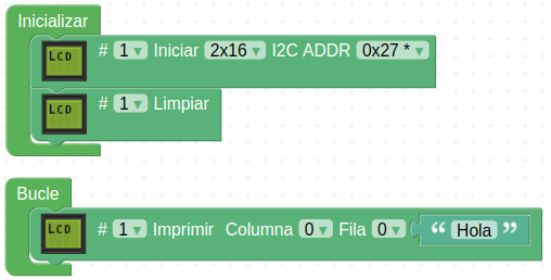 5. A continuación, en el bloque “Bucle”, sitúa alguno de los bloques de visualización de la pantalla LCD, en función de lo que desees mostrar. Comienza mostrando el texto “Hola”, con el bloque "LCD #1 Imprimir...":