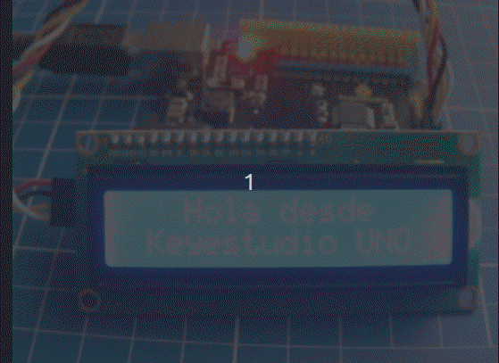 7. De la categoría Visualización/Pantalla LCD I2C, elige el bloque “LCD #1 Imprimir…” y lo colocas un par de veces de manera que en uno aparezca el texto "Hola desde" en la fila 0 y en el otro "Keyestudio UNO" en la fila 1. Ahora, añade una espera de 2 segundos (2000 milisegundos). Cambia el valor a 2000. Para añadir la espera de 2 segundos, ve a la categoría “Tiempo” y elige el bloque “Esperar 1000 milisegundos”. Haz que se limpie la pantalla y que a continuación se muestre la letra "S" en la fila 0 y columna 0. A continuación, de la categoría Visualización/Pantalla LCD I2C, elige el bloque “LCD #1 Imprimir… Símbolo…” y pon el número correspondiente a la letra "i" ajustando la columna a 1. Ahora ponemos a partir de la columna 2 el resto del texto ("mbolo"). Ya solamente queda colocar en la fila uno la definición del símbolo del muñequito. Pon otra espera de 2 segundos. El código completo de la programación debe quedar así: