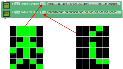 6. Vamos a crear dos símbolos propios, un muñequito y una letra "i" pero acentuada. La definición del símbolo la copiamos en un bloque "LCD #1 Definir símbolo..." y le asignamos el número 1 y al de la letra "i" le asignamos el número 2. Estos bloques de definición se ponen en "Inicializar".