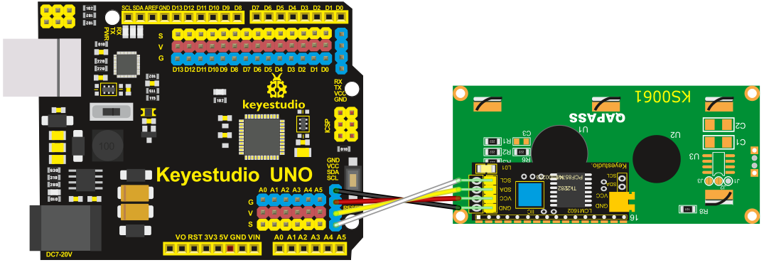 1. Comenzamos conectando la pantalla LCD a la placa a través de los pines de comunicación I2C según muestra la imagen siguiente: