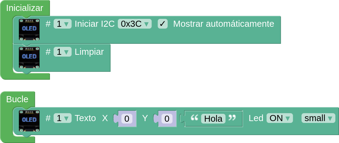 5. A continuación, en el bloque “Bucle”, sitúa alguno de los bloques de visualización de la pantalla OLED, en función de lo que desees mostrar. Comienza mostrando el texto “Hola”, con el bloque “OLED #1 Text…”: