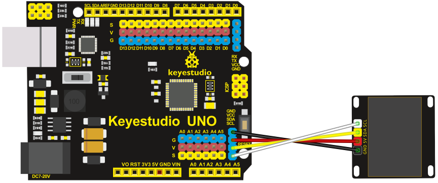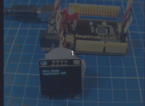 1. Comenzamos conectando la pantalla OLED a la placa a través de los pines de comunicación I2C según muestra la imagen siguiente: