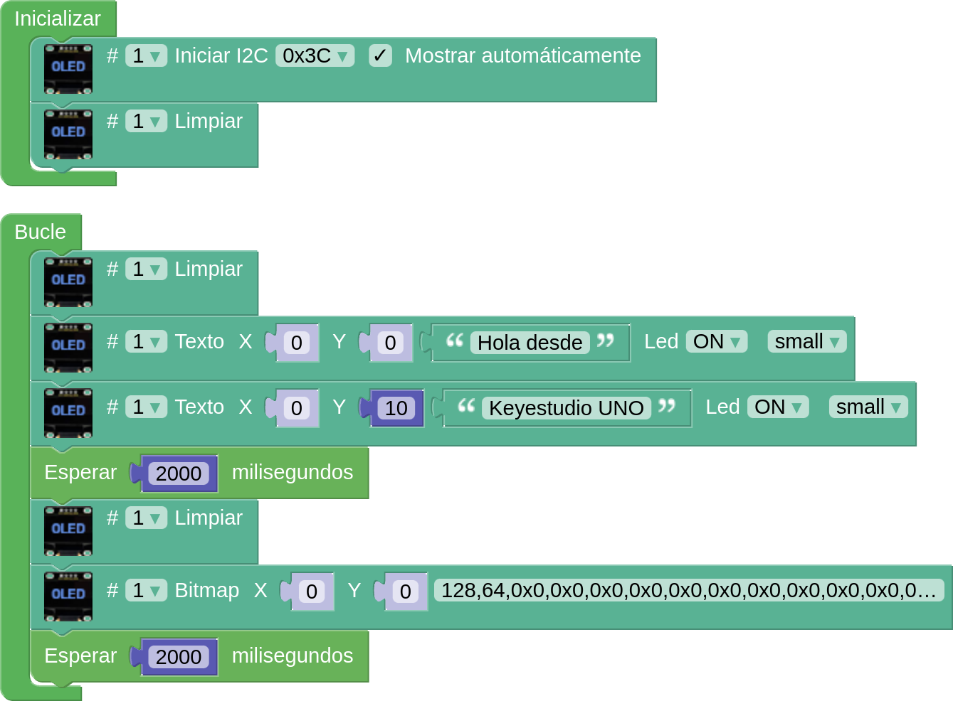 6. Ahora, añade una espera de 2 segundos (2000 milisegundos), haz que se limpie la pantalla y que a continuación se muestre una imagen. Para añadir la espera de 2 segundos, ve a la categoría “Tiempo” y elige el bloque “Esperar 1000 milisegundos”. Cambia el valor a 2000. A continuación, de la categoría Visualización/Pantalla OLED, elige el bloque “OLED #1 Bitmap…” y cargalo con una imagen. Poner otra espera de 2 segundos. El código completo de la programación debe quedar así: