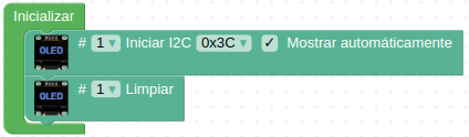 4. Para utilizar la pantalla OLED, primero debes inicializarla. En el bloque “Inicializar”, sitúa un bloque “OLED Iniciar I2C”, que encontrarás en la categoría "Visualización/Pantalla OLED". Pon también el bloque “Limpiar” para asegurar que la pantalla no tenga nada escrito al inicio.