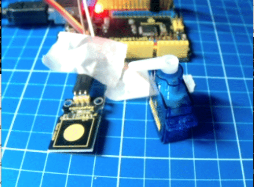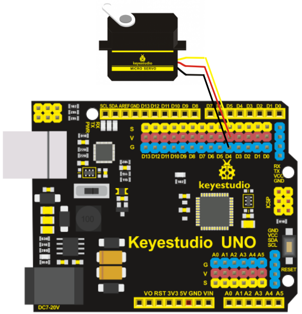2. Conecta el servomotor a alguno de los pines digital de la placa (en el ejemplo utilizaremos el pin D4), teniendo en cuenta que el cable marrón del servomotor corresponde a la G -tierra- (color azul de la placa), el cable rojo del servomotor corresponde a la V -voltaje- (color rojo de la placa) y el cable naranja del servomotor corresponde al S -señal- (color amarillo de la placa).