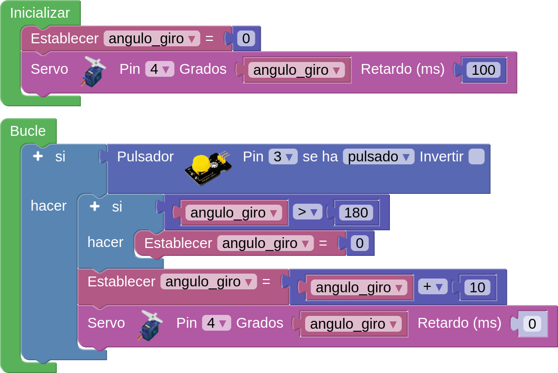Vamos a crear un programa en el que cada vez que pulsemos el botón el servo gire un ángulo de 10 grados. Si no activamos el pulsador el servo permanecerá en su posición actual. La posición inicial del servo será en cero grados y si se alcanzan los 180 grados de giro retornará a su posición inicial.