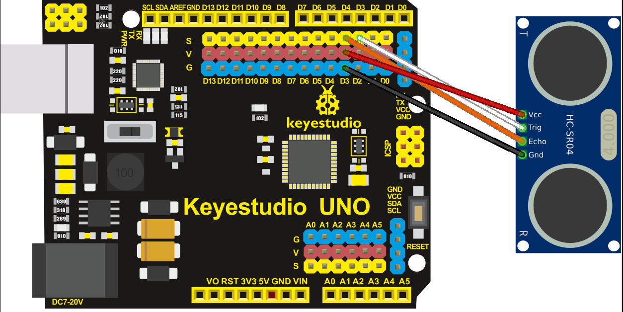 2. Conecta el sensor a pines digitales de la placa (en el ejemplo utilizaremos el pin D2 para Trigger y D3 para Echo). Además tienes que conectar los pines de alimentación teniendo especial cuidado de que VCC se conecta con V y Gnd con G.