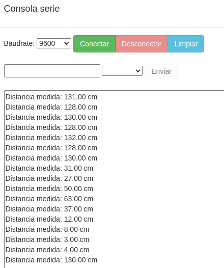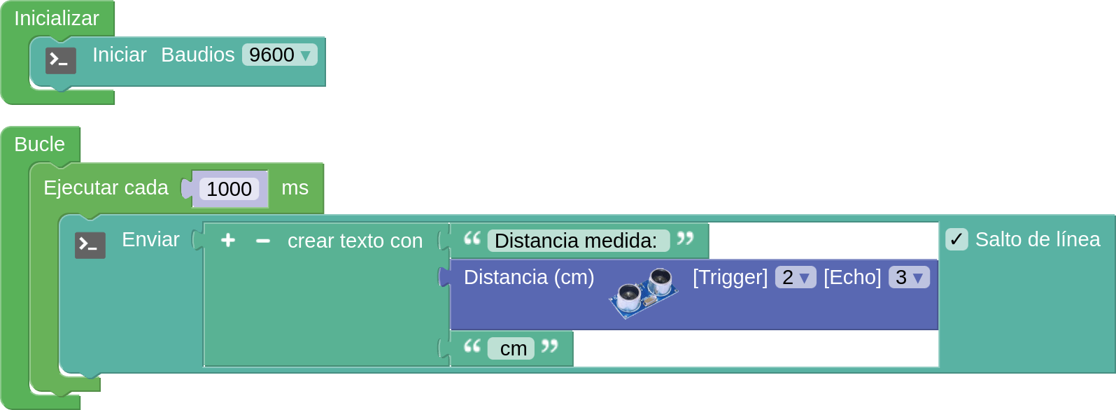 3. Vamos a crear un programa en el que cada segundo se envíe a la consola una composición de texto de la forma "Distancia medida: xx.xx cm". El programa puede ser como el siguiente: