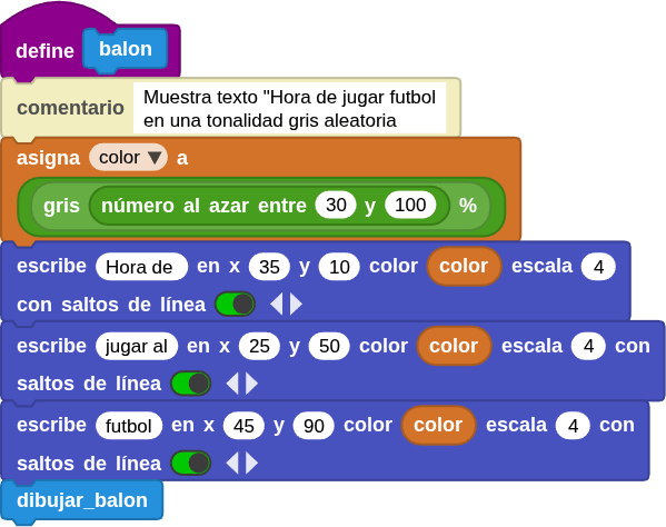 | Función balon | Dibuja el texto “Hora de jugar futbol” y el balón. |