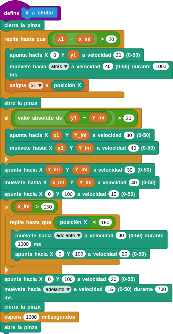 x_ini). - Se orienta hacia un punto de referencia con velocidad de giro 30. Se mueve hacia atrás a velocidad 40 durante 1 segundo (1000 ms). Luego actualiza su posición x1 con su valor actual.
