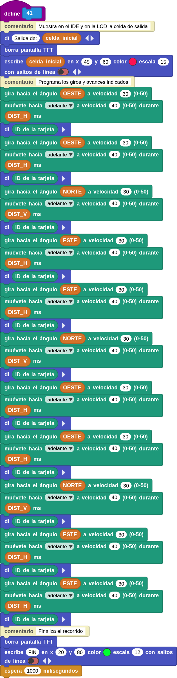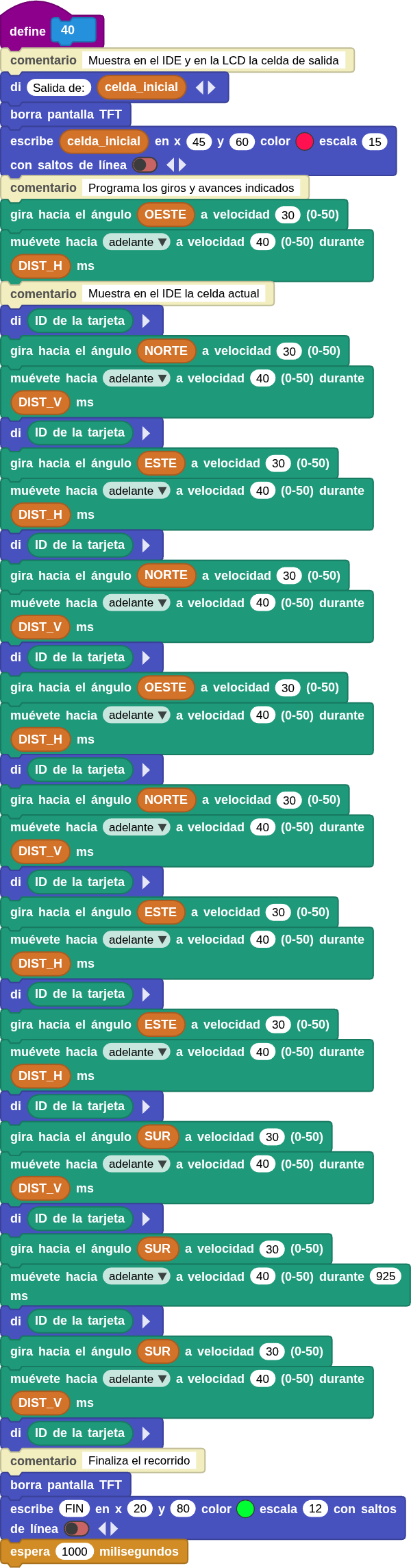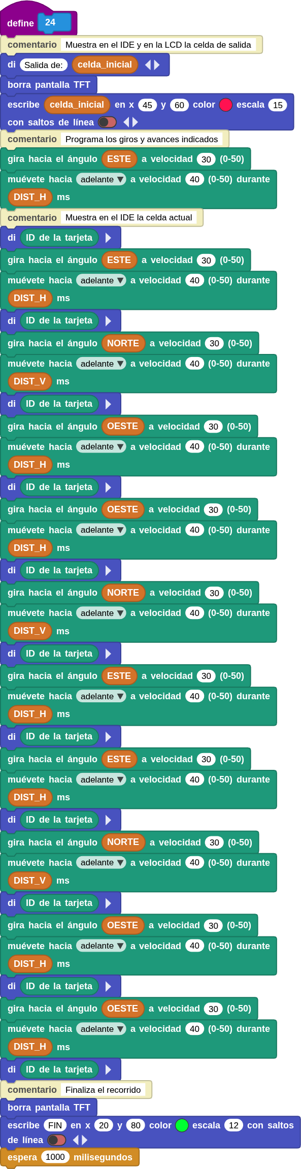 - Cada movimiento consiste en girar hasta la orientación absoluta que lleva a la casilla objetivo y avanzar la distancia apropiada (63 mm para E/O o 60 mm para N/S).