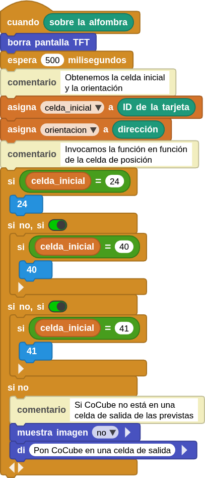 Finalmente programamos el comportamiento mediante un bloque interruptor activo cuando CoCube está situado sobre la alfombra