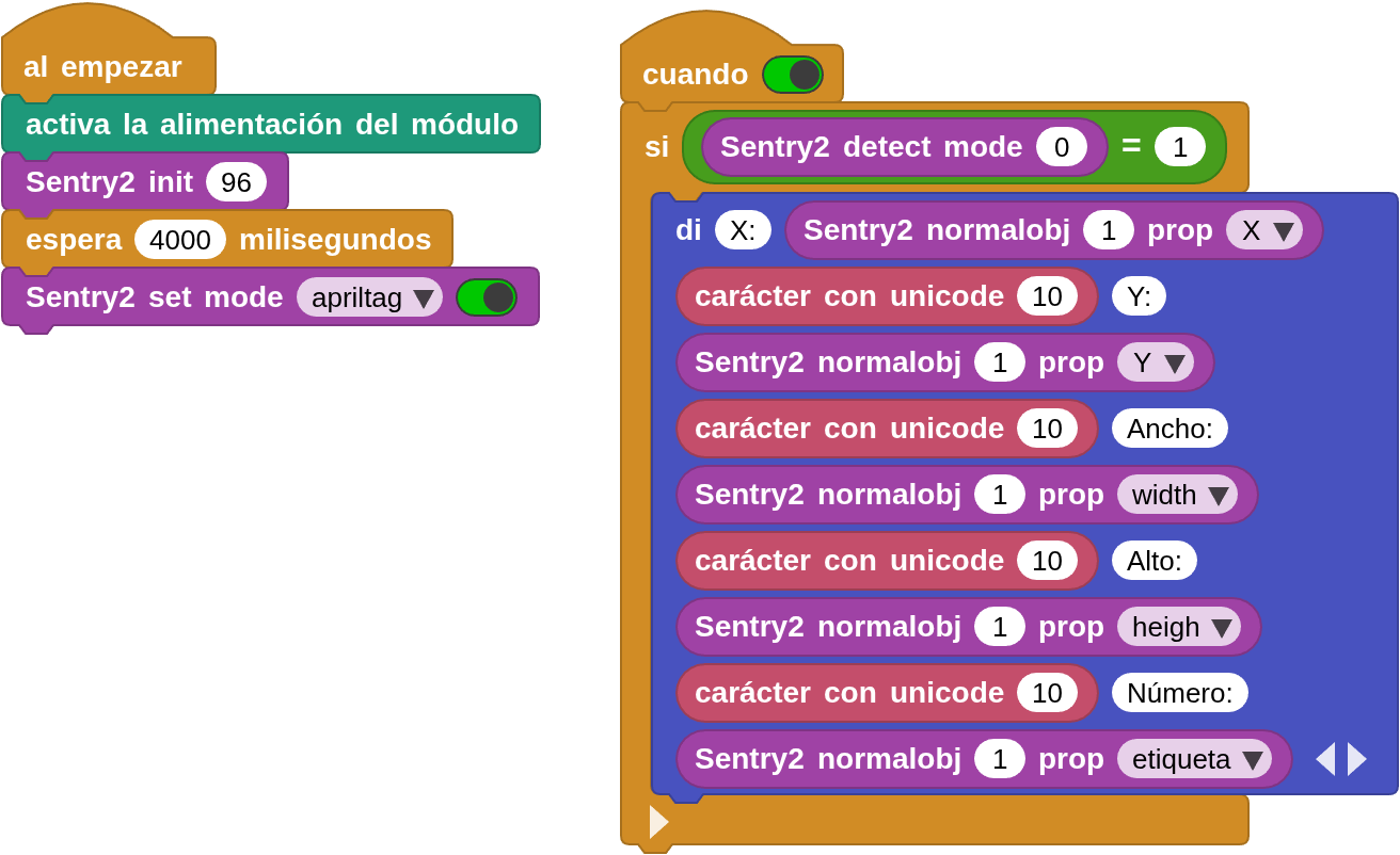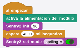 ③ Debajo de un bloque sombrero "al empezar" coloca el bloque "activa la alimentación del módulo" para que la Sentry2 se alimente a través del conector I2C. A continuación inicializa la interfaz I2C y coloca una espera de 4 segundos para dar tiempo a que el módulo de la cámara se inicie correctamente y, a continuación, establece el modo de algoritmo de la cámara en modo AprilTag.
