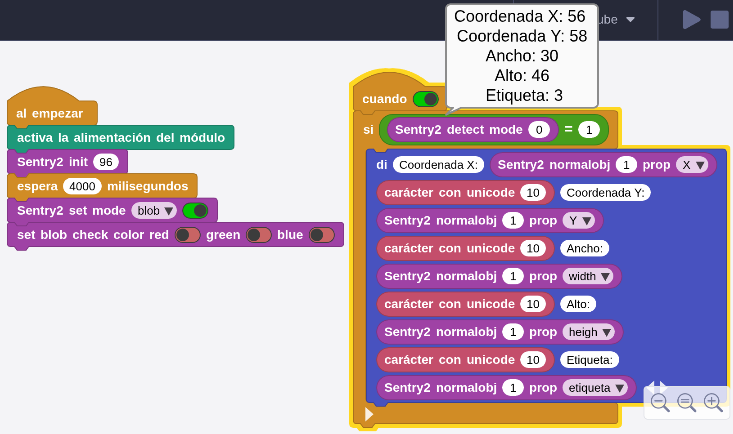 ③ Debajo de un bloque sombrero "al empezar" coloca el bloque "activa la alimentación del módulo" para que la Sentry2 se alimente a través del conector I2C. A continuación inicializa la interfaz I2C y coloca una espera de 4 segundos para dar tiempo a que el módulo de la cámara se inicie correctamente y, a continuación, establece el modo de algoritmo de la cámara en modo blob para el reconocimiento de bloques de color. Finalmente establece como color de detección por ejemplo rojo.