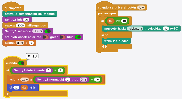 ③ Debajo de un bloque sombrero "al empezar" coloca el bloque "activa la alimentación del módulo" para que la Sentry2 se alimente a través del conector I2C. A continuación inicializa la interfaz I2C y coloca una espera de 4 segundos para dar tiempo a que el módulo de la cámara se inicie correctamente y, a continuación, establece el modo de algoritmo de la cámara en modo blob para el reconocimiento de bloques de color. Finalmente establece como color de detección el azul.