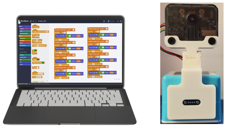 Robot CoCube, conector soporte para Sentry2 y ordenador ejecutando el IDE de MicroBlocks en cualquiera de sus versiones, estable instalada localmente o versiones online tanto estable como pilot. En cualquier caso tenemos que añadir las bibliotecas CoCube, CoCube module y Sentry2 AI camera.