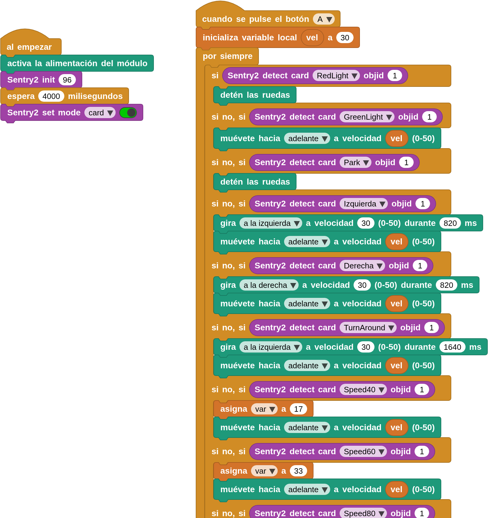 ④ Bajo un bloque sombrero "cuando se pulse el botón..." se comprueba continuamente si se detecta alguna de las tarjetas. Si es cierto el robot realiza la tarea correspondiente a la tarjeta detectada.