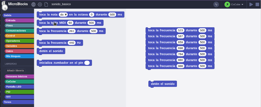 Programar el robot CoCube para que reproduzaca sonidos y melodias.