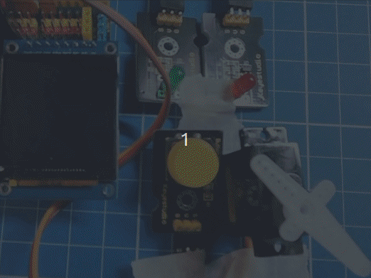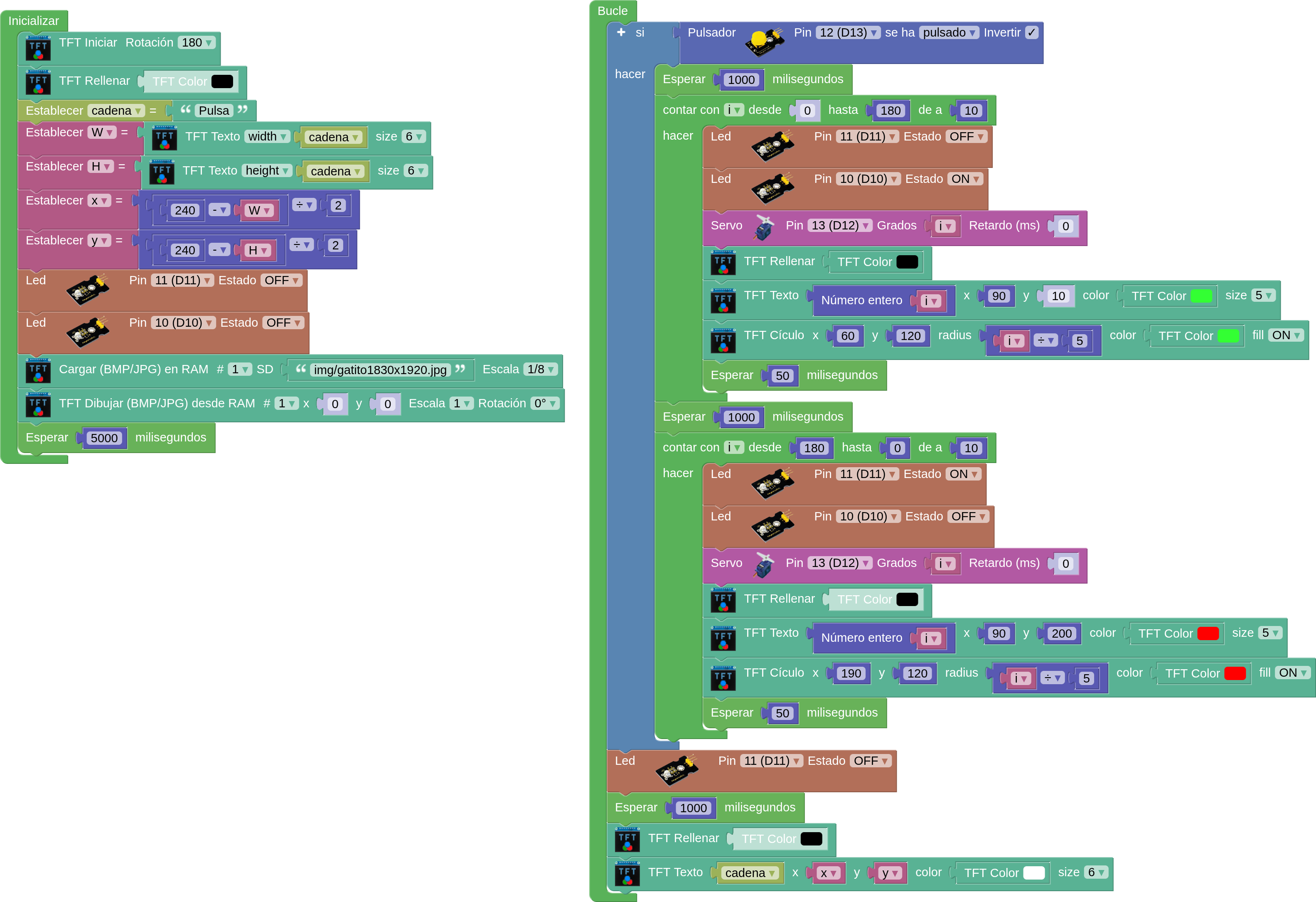 Vamos a realizar un ejercicio sencillo que mezcle un poco de todo. En el inicio se carga en RAM y se muestra una imagen durante 5 segundos. En el bucle se controla que un servo gire en ambos sentidos cuando se acciona un pulsador. Mientra el servo gira se muestra en la pantalla TFT el ángulo que ha girado y se dibuja un círculo del mismo color. Se utiliza color verde para sentido horario y rojo para antihorario. Al mismo tiempo que el servo gira se enciende un LED del mismo color que el sentido de giro. Si no se acciona el pulsador en la pantalla se muestra el texto "Pulsa" invitando a dicha acción.