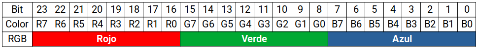 Un color RGB888 con una profundidad de color de 24 bits se representa así en binario: