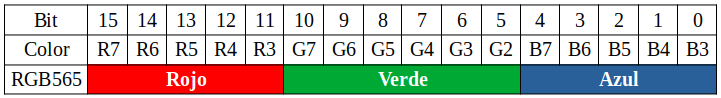 - RGB565: Rojo: 5 bits (0–31), Verde: 6 bits (0–63), Azul: 5 bits (0–31), Total: 16 bits.
